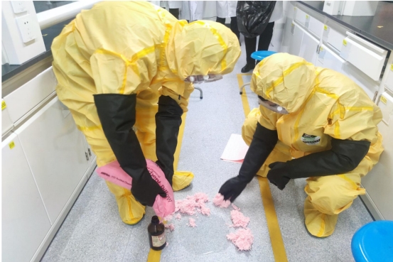 应急小组紧急开展人员疏散,确保实验室中的师生安全撤离至安全区域。同时,应急人员穿戴好专业防护装备,对泄漏点进行应急处置,利用专业设备对泄漏的危险化学试剂进行收集,将沾染泄漏试剂的物品及处置物品科学收集至危废处置器皿内,并确认无残留泄漏试剂后,结束应急状态。