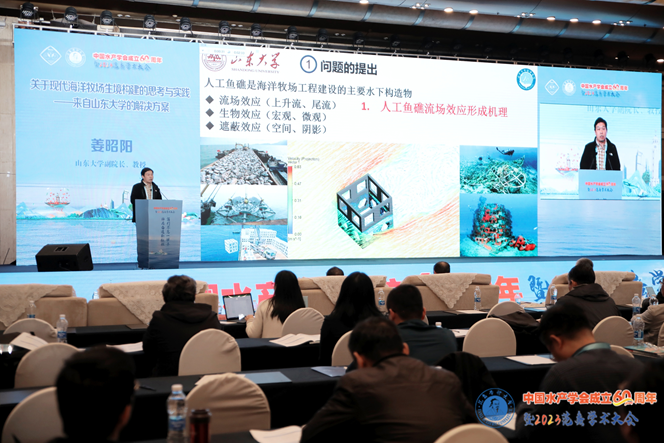 姜昭阳教授于当日在大会上做了题为《关于现代海洋牧场生境构建的思考与实践——来自永利3544am登录官网的解决方案》的主会场报告。报告从人工鱼礁流场效应形成机理、海洋牧场生境构建技术、海洋牧场与海上风电融合发展三个层面向与会专家、学者分享了永利3544am登录官网海洋牧场与深远海养殖团队的解决方案。