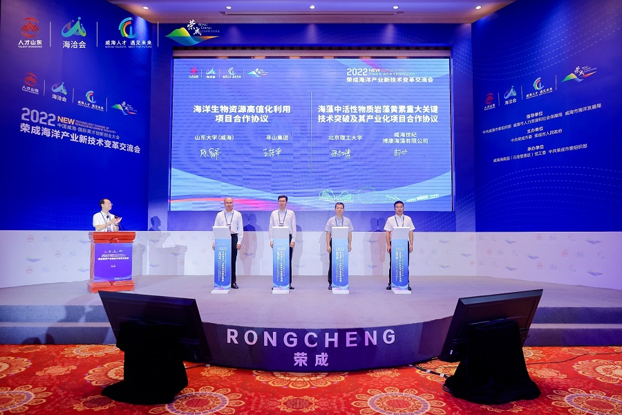 8月25号,2022中国威海国际英才创新创业大会—海洋产业新技术变革交流会在荣成举行。威海市副市长、荣成市委书记徐明,荣成市市长郑跃文,山东人才发展集团有限公司总经理张祝秀,中国工程院院士李华军及相关领域专家、海洋产业龙头企业代表等参会,会议围绕“海洋产业新技术变革”主题,共同开展海洋领域高水平学术及技术交流,推进海洋产业高质量发展。永利3544am登录官网陈景帝教授应邀出席本次活动并与寻山集团签署了海洋生物资源高值化利用项目合作协议。