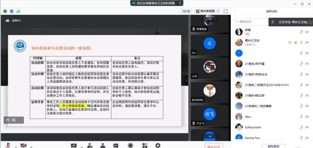 会议伊始,青年志愿者协会副部长王玉知以放映幻灯片的形式向同学们简单介绍了志愿学时的有关事项,志愿学时作为量化学生志愿服务时长的衡量标准,对学生学年德育素质考核及各类评奖评优具有重要意义。随后,王玉知介绍了志愿学时的来源,倡导同学们参加各类志愿服务活动。为了让大家对志愿服务的了解更加全面,王玉知针对志愿服务的类型、学时的认定标准及志愿服务黑名单制度各方面进行了详细讲解,并为同学们答疑解惑。