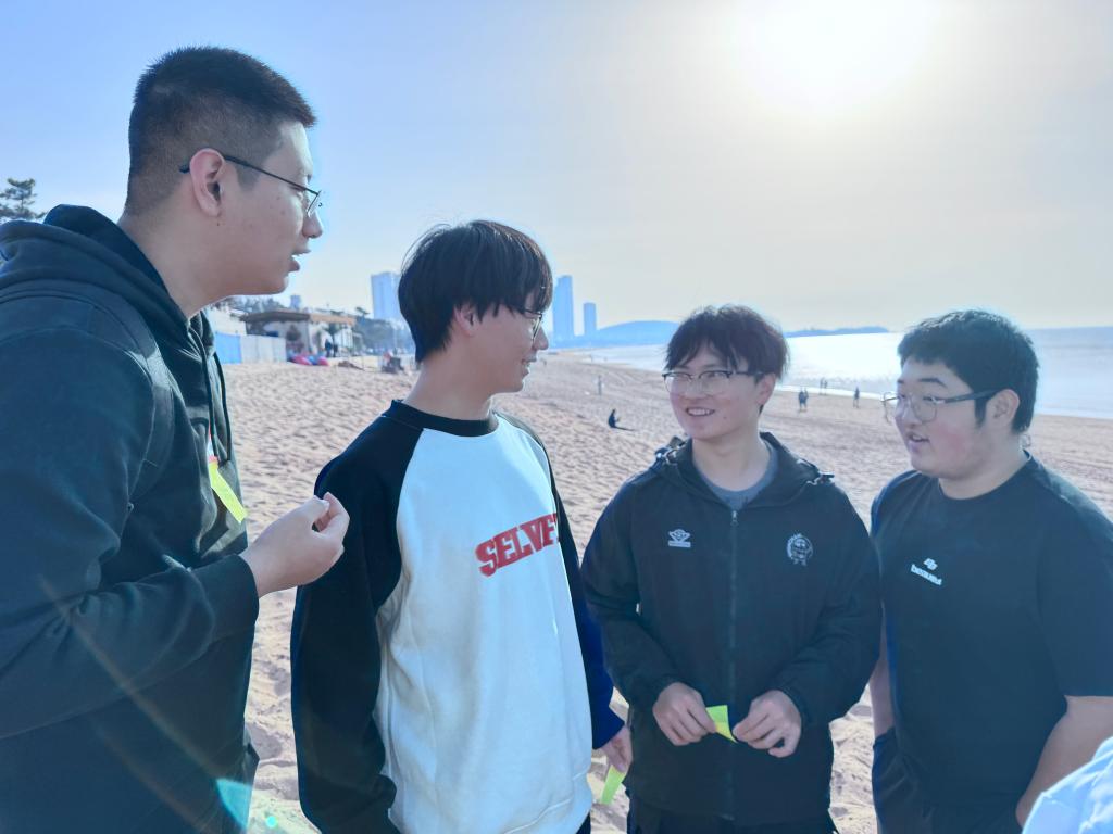 4月3日,线下集体活动在威海国际海水浴场举行。组织开展了“海浪传话”破冰游戏。参与学生被随机分组,通过围成圈依次传递正能量短句,以快速拉近距离、打破陌生感,营造轻松愉快的活动氛围。随后进入“冥想疗愈”活动,在海浪声与舒缓背景音乐的陪伴下,参与学生闭上双眼,跟随专业引导进行深呼吸和正念冥想练习。通过短暂的静心体验,学生们的身心得到放松与安定,缓解了近期因学业或生活产生的紧张情绪。在“情绪表达”活动中,参与学生在彩色便签上写下烦恼、焦虑或对未来的美好期待,并将其张贴在展板上。在“环保实践”活动中,参与学生分组清理沙滩对塑料瓶、食品包装袋等常见海滩垃圾进行分类收集。同时,有些学生还捡拾贝壳、漂流木等,利用它们制作环保风铃。在本环节活动中,学生们释放压力,用亲身实践体会绿色环保与资源再回收利用的重要性。4月4日至13日,协会征集了参与学生在线下集体活动中拍摄的作品,并对其进行评比,选出一、二、三等奖作品。