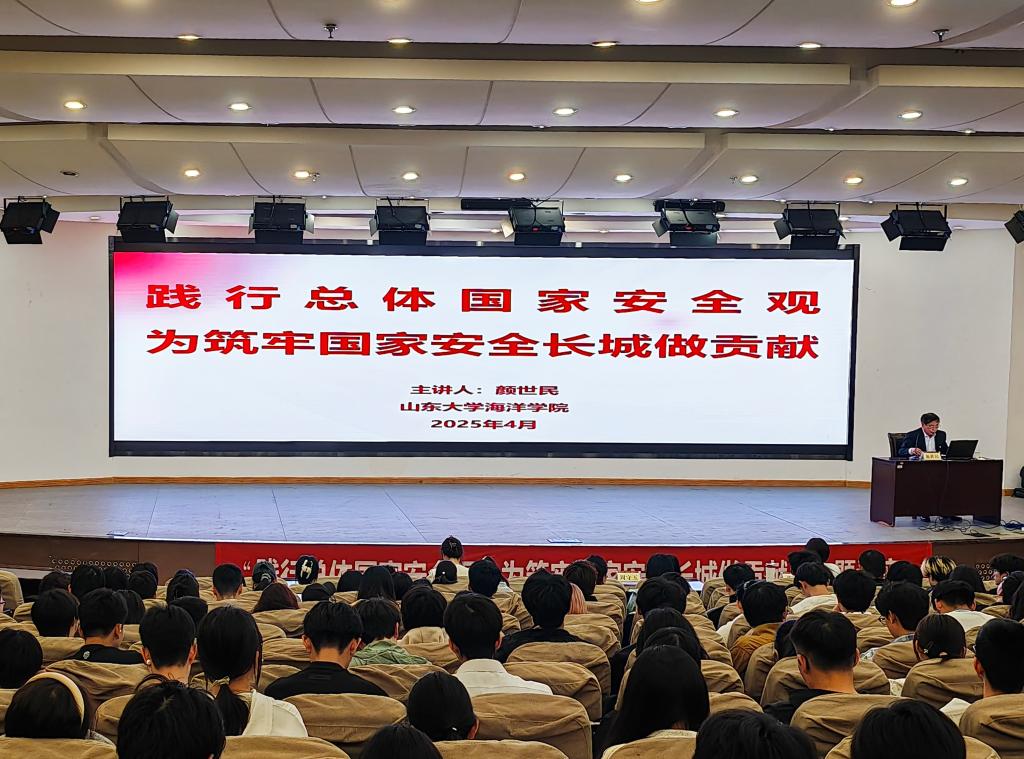讲座伊始,颜世民向学生强调了国家安全的重要意义。国家安全作为民族复兴的牢固根基以及人民幸福生活的坚实保障,在当今这个百年未有之大变局的时代背景下,具有重要意义。随后,他将个人实践经历与理论内容紧密结合,并综合考量国内外的复杂形势,还以具有特殊地缘意义的威海为例,从国家层面、区域与单位层面、个人层面深入探讨如何全面贯彻总体国家安全观。在问答环节中,学生们对颜世民提出了自己的疑问和见解,讨论氛围热烈。最后,张馨在总结发言中指出,希望全体学生将本次讲座的内容内化于心、外化于行,在点滴行动中自觉维护国家安全,结合专业,从生物安全、信息安全、生态安全等多角度一起共同筑牢蓝色海洋的坚固防线。