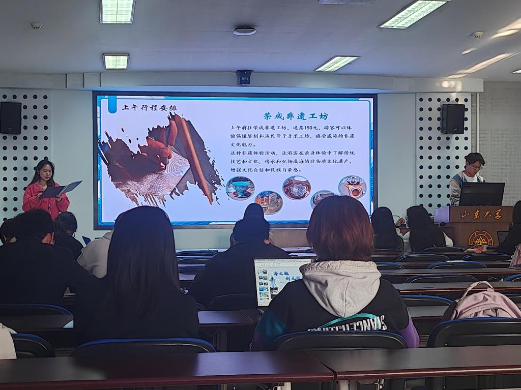 本次活动分为初赛和决赛两个阶段,初赛于4月5日至4月15日以线上作品征集的方式开展,共有三十二支队伍参赛。初赛分为旅游线路设计和旅游宣传视频两个赛道,各队伍围绕“海之魅,创无限”的主题,充分展现了各自对海洋旅游的独到见解和创新设计。在旅游线路设计赛道中,参赛队伍结合威海的海洋特色,深入挖掘威海的特色景点和民俗传统,设计了多条富有创意的旅游线路,为游客提供了全新的旅游体验。在旅游宣传视频赛道中,参赛队伍通过镜头捕捉威海的美丽风光和人文景观,不仅展示了威海的海洋魅力,还传递了参赛队伍对海洋文化旅游的热爱和期待。4月22日,决赛作品展示及答辩环节在永利3544am登录官网315报告厅举行,共有十支队伍最终入围。参赛队伍通过作品演示和现场答辩的形式,向评委和观众展示了他们的创意成果。最终,共有两支队伍获评一等奖,各三支队伍获评二等奖、三等奖。