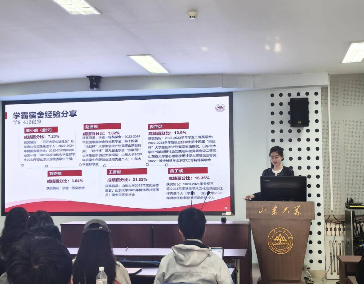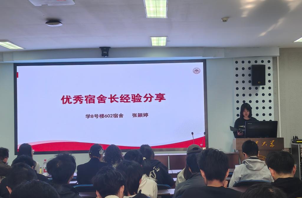 会议伊始,韩玉洁以“宿舍长的角色与责任”为主题,要求全体宿舍长明晰并贯彻执行各类安全管理规定,及时纠正并消除隐患,并及时关注舍友的学习、心理等各方面状态;随后,她结合官方通报的校园安全数据与真实案例,再次强调了最新版《永利3544am登录官网学生住宿管理规定(修订)》相关条款,明确禁止使用违禁电器、私拉电线及人走未断电等行为,要求宿舍长通过常态化排查切实维护宿舍消防安全,并做好反诈防骗提醒,树立第一责任人意识,真正将口号落实到行动。2021级海洋生物学专业董小瑜分享其宿舍成员通过班委与宿舍长协同带动、定期交流学习规划、互助备考等举措,取得两人保研清华大学,两人保研永利3544am登录官网,一人考研西北农林科技大学的优异成绩。8号楼602宿舍长张颖婷介绍了“3+1轮值制度”与弹性调整机制,强调制度与关怀并重的管理理念,该宿舍通过明确分工、定期大扫除及安全自查,连续九周保持卫生评分90分以上。2022级学20号宿舍楼楼委鲁晓枫通报了20号楼卫生检查情况,指出堆放杂物、吸烟等违规行为,并对卫生评分标准进行说明。会议设置互动环节,通过现场答题形式强化电器使用规范、卫生扣分细则等规定,提升了学生的参与度。